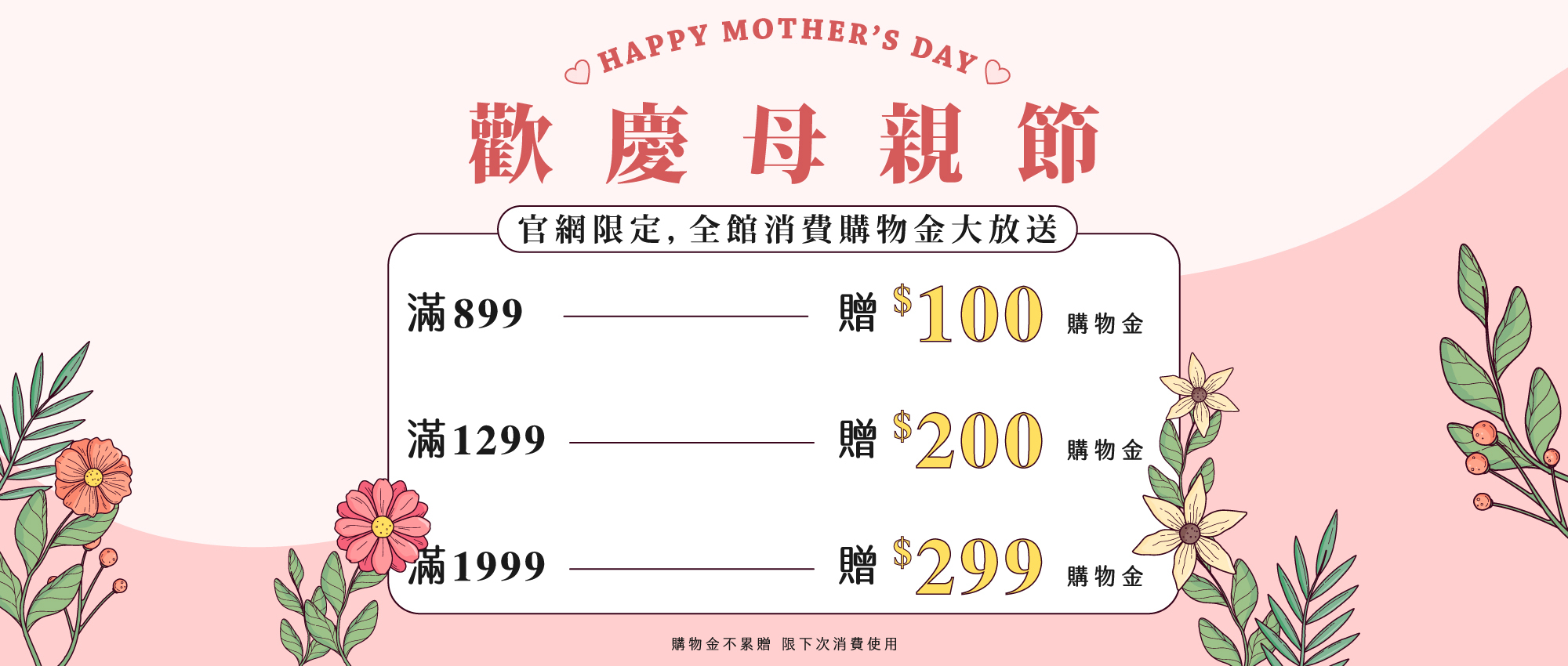 1. 活動期間,全館消費滿$899,贈$100購物金、滿$1299,贈$200購物金、滿$1999,贈$299購物金,購物金於取貨完成訂單後系統自動發送。