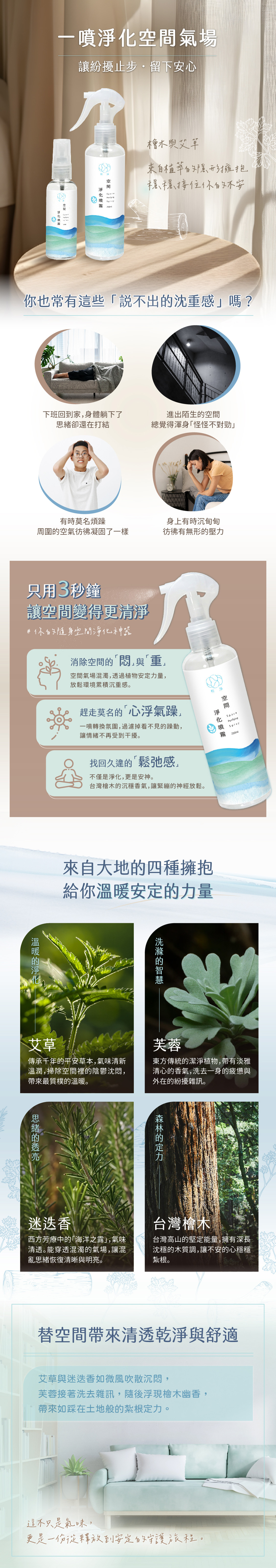 距離身體30公分噴灑1–2下,讓香霧落在氣場周圍,達到安定的效果。
