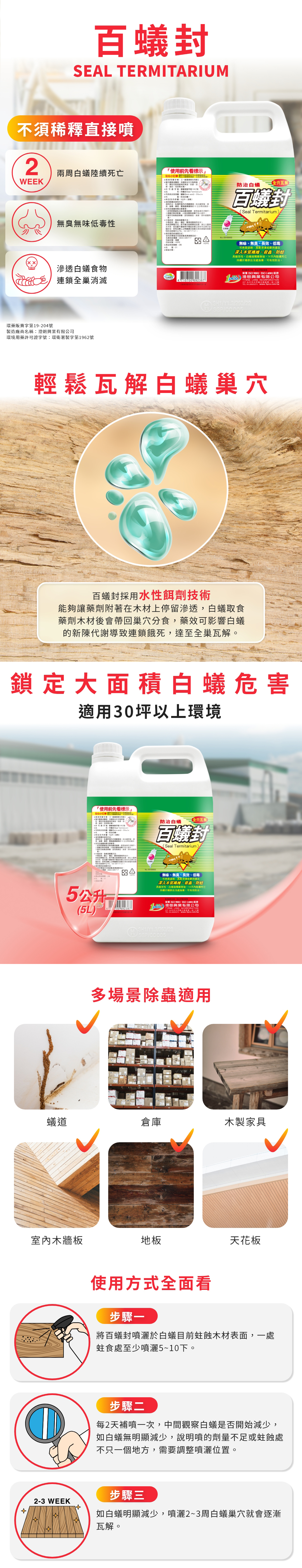 • 使用方法:每平方公尺施用50毫升藥液於白蟻出沒處。